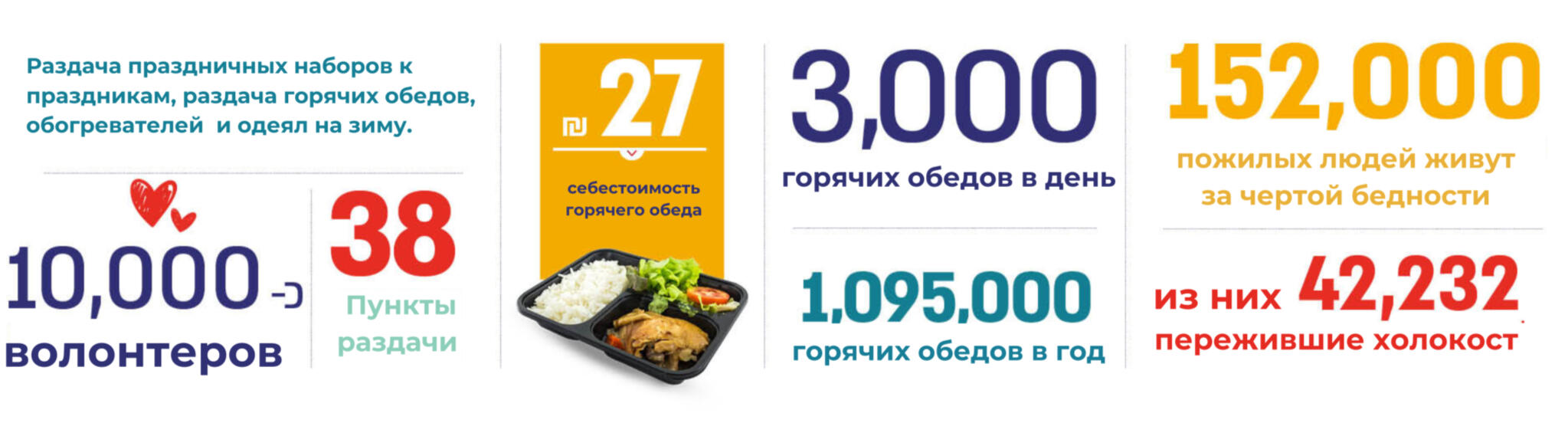 בכל שבוע אנו מארגנים אלפי ארוחות חמות לאנשים מבוגרים ולניצולי שואה הזקוקים לעזרתנו. רבים מהם חיים לבדם ואינם מסוגלים להכין אפילו ארוחה פשוטה בעצמם. בנוסף, אנו מארגנים עבורם פעילויות ומפגשים חברתיים המעניקים שמחה, קשר אנושי ותחושת תמיכה.