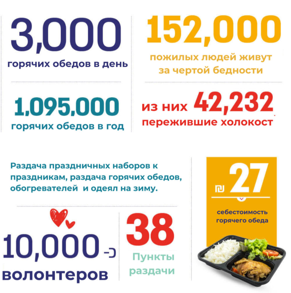 בכל שבוע אנו מארגנים אלפי ארוחות חמות לאנשים מבוגרים ולניצולי שואה הזקוקים לעזרתנו. רבים מהם חיים לבדם ואינם מסוגלים להכין אפילו ארוחה פשוטה בעצמם. בנוסף, אנו מארגנים עבורם פעילויות ומפגשים חברתיים המעניקים שמחה, קשר אנושי ותחושת תמיכה.